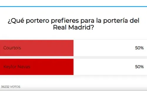 Mientras que Keylor Navas recibió 22,200 votos mediante un “fav”, Thibaut Courtois solamente dispuso de 1200 retweets.Al mismo tiempo, otra encuesta dejó mano a mano a los dos guardametas. Esta vez fue Diario Marca, que de 36232 votos, la mitad fueron para el ex Chelsea y la otra mitad para el tico. Sin nunguna duda, Navas todavía cuenta con la consideración del madridismo.