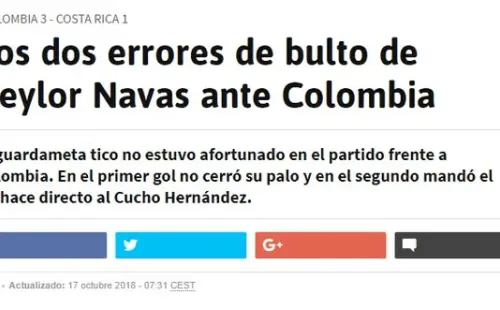 “Los dos errores de bulto de Keylor Navas ante Colombia”, así tituló el diario su análisis del desempeño del arquero costarricense, en el queaseguran que el tico no estuvo “afortunado” en el partido que se celebró en el Red Bulls Arena de Nueva Jersey.