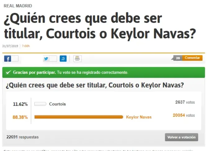 “¿Quién crees que debe ser titular, Courtois o Keylor Navas?” lepreguntó el diario deportivo a sus lectores; y los resultados fueron contundentes.