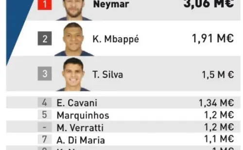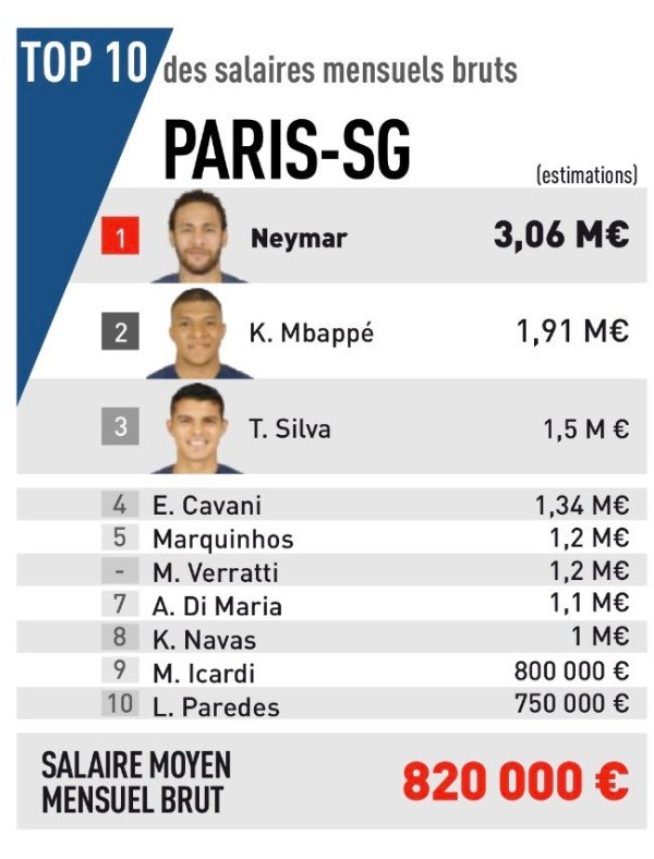 En el primer lugar aparece Neymar, con un ingreso de3.06 millones de euros mensuales. Le sigue Kylian Mbappé, Thiago Silva, Edinson Cavani, Marquinhos, Verratti, Di María, y en el octavo puesto aparece Keylor Navas, con un sueldo de un millón de euros al mes.