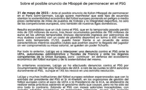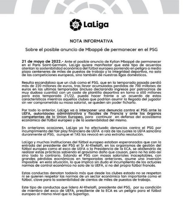 “Lo que va a hacer el PSG renovando a Mbappé con grandes cantidades de dinero (a saber dónde y cómo las paga) despues de dar pérdidas por 700M€ en las últimas temporadas y tener mas 600M€ de masa salarial, es un INSULTO al fútbol. Al-Khelafi es tan peligroso como la Superliga”, redactó el directivo