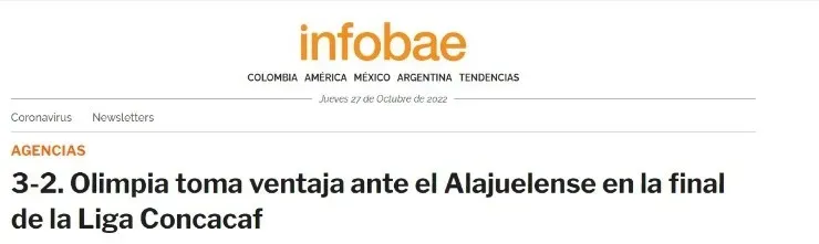 Olimpia se quedó con el encuentro de ida de la finalde la Liga Concacaf sobre Alajuelense (3-2) en un partidomuy intenso con goles y emociones entre ambos conjuntos centroamericanos. Ante este primer resultado en elEstadio Nacional de Tegucigalpa, la prensa internacional tuvo su reacción y ahora todo se definirá en Costa Rica desde elEstadio Alejandro Morera Soto