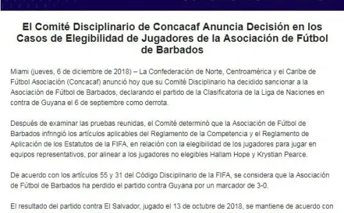 El comité disciplinario de la Concacaf confirmó el castigo emitido en diciembre a Barbados por alinear a dos jugadores no elegibles en el empate 2-2 con Guyanay le asignó una derrota, por lo que no tendrá motivo, ni moral para recibir en marzo a Nicaragua que ya se ve en la Copa Oro 2019.