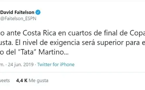 “El nivel de exigencia será superior para el equipo del Tata Martino”, dijo en principio por Twitter el comunicador que aparece en programas de alta sintonía como Cronómetro, de la cadena ESPN.