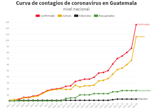 Guatemala está ingresando a la fase 2 de coronavirus. Ya tiene 126 casos confirmados y un fallecido. El gobierno decreto una cuarentena para los mayores de 65 años con el fin deevitar la propagación de la enfermedad. Los números venían bien, pero en 24 horas se creció un 45%. Al paciente cero se lo ubica por el 13 de marzo, un connacional que volvió de un viaje de España. Todavía no se sabe, a ciencia cierta, si ya hubo contagios comunitarios o todos de estrecho contacto con casos importados.