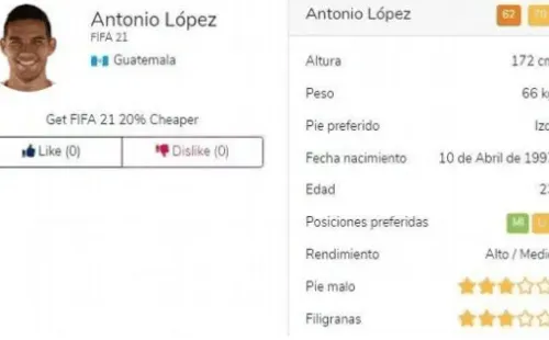 Sin embargo, Guatemala tendrá representación en este videojuego gracias a la presencia del mexicano-guatemaltecoAntonio de Jesús López, quien juega para el prestigiosoClub América, de México. ‘Chucho’, quien apenas ha disputado dos partidos con la Selección Nacional de Guatemala(ante México 0-3 y Nicaragua 0-0 ),y que será hasta la fecha el único seleccionado nacional.