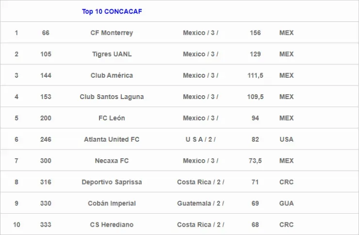 En la CONCACAF lidera el Monterrey de México, luego de obtener la Concachampions y poner en problemas al Liverpool de Klopp en el Mundial disputado en Qatar, donde se alzaron con el tercer puesto.