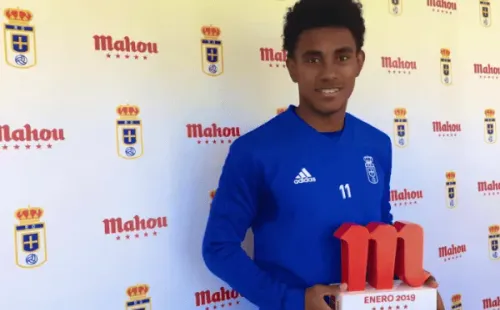 El atacante panameño Edgar Yoel Barcenas es cada vez mas querido por la afición del Real Oviedo. Pasa por un gran momento y ya se sabía que había ganado el premio al mejor jugador del mes del equipo, peroahora lo recibió en físico.
