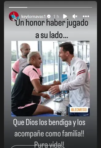 A través de sus redes sociales Keylor Navas no quiso dejar pasar la oportunidad para dedicarle unas palabras a Lionel Messi tras haber estado juntos en el PSG. “Un honor haber jugado a su lado. Que Dios los bendiga y los acompañe como familia. ¡Pura vida!”, escribió el guardameta costarricense.
