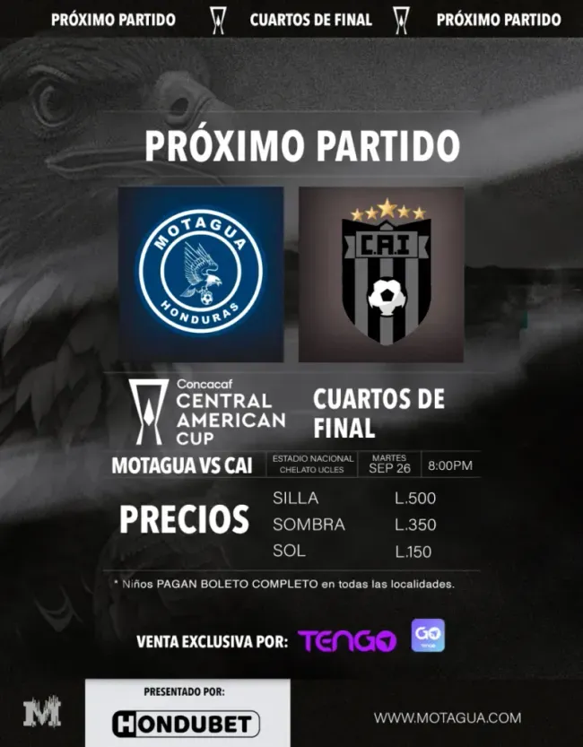 Motagua recibirá a CAI hoy, martes 26 de septiembre, a las 8:00 p.m. de Honduras y el resto de Centroamérica (9:00 de Panamá), en el Estadio Nacional “Chelato” Uclés de Tegucigalpa. El encuentro será transmitido EN VIVO y EN DIRECTO por los siguientes canales de TV y streaming.