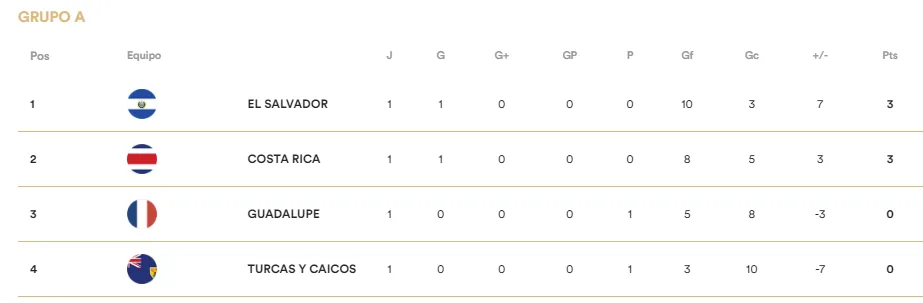 La selección de Costa Rica debutó contra Guadalupe con un importante triunfo tras lograr un marcador de 8 por 5, una victoria inapelable aunque al final, la diferencia de goles se redujo considerablemente y esto no les pemite ocupar el primer lugar de su grupo. Los ticos siempre estuvieron delante en el marcador y dominaron a placer el juego.