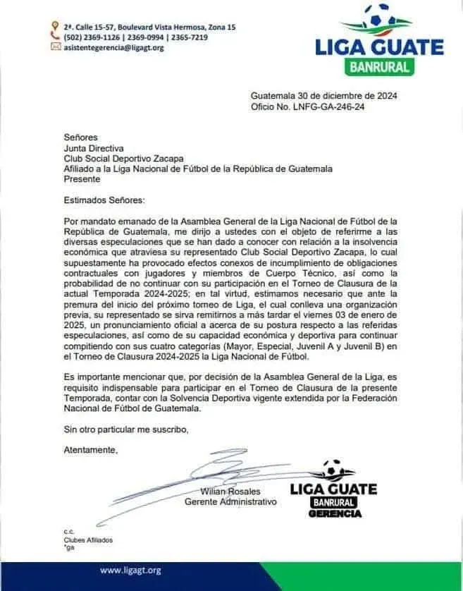 La Liga Nacional de Guatemala ha enviado una carta formal al Deportivo Zacapa solicitando que, a más tardar el viernes 3 de enero de 2025, el club informe sobre su situación económica y deportiva. Esta comunicación busca esclarecer si la institución estará en condiciones de continuar participando en las competiciones oficiales de la temporada. La medida responde a las preocupaciones sobre la estabilidad del equipo, que podrían afectar tanto su desempeño como el desarrollo del campeonato.