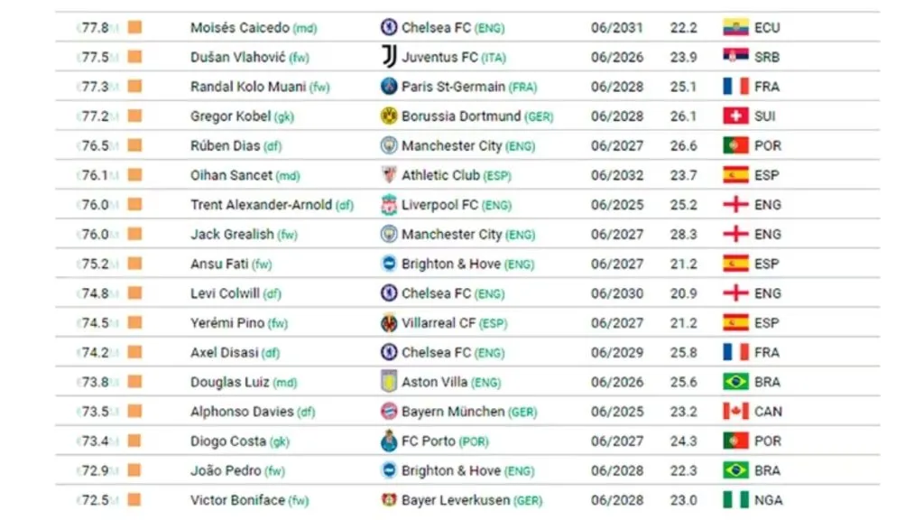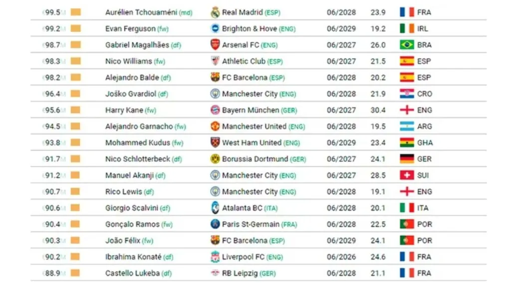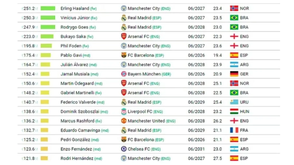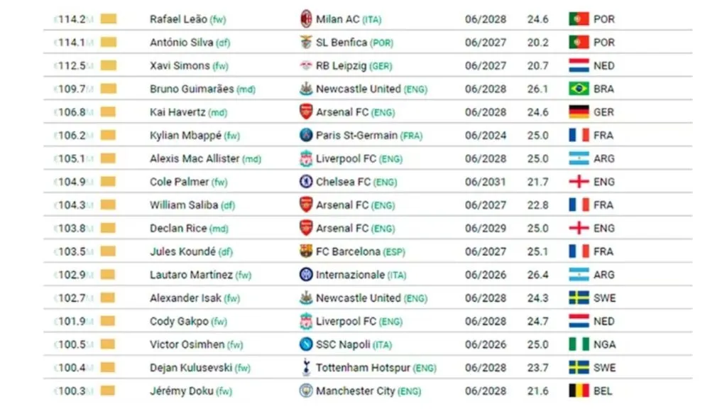 Además, en un giro inesperado en el mundo del fútbol, Kylian Mbappé, quien durante varios años ocupó los primeros lugares en la lista de jugadores más valorados, ha experimentado un notable descenso, cayendo hasta la posición número 27. Este descenso en su valoración de mercado se debe en gran medida a su situación contractual con el PSG.