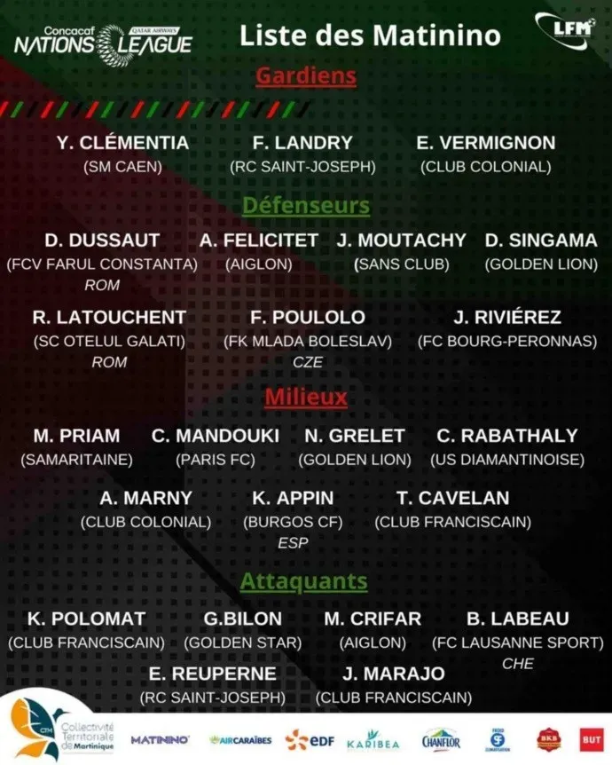 Sobre la convocatoria de Martinica, en esta ocasión, los representantes caribeños no han incluido a Patrick Burner y Kevin Fortune en la lista de jugadores convocados. Estos dos futbolistas fueron los autores de los goles en el encuentro de la Copa Oro, un partido que culminó con una victoria ajustada de 2-1 a favor del territorio francés.