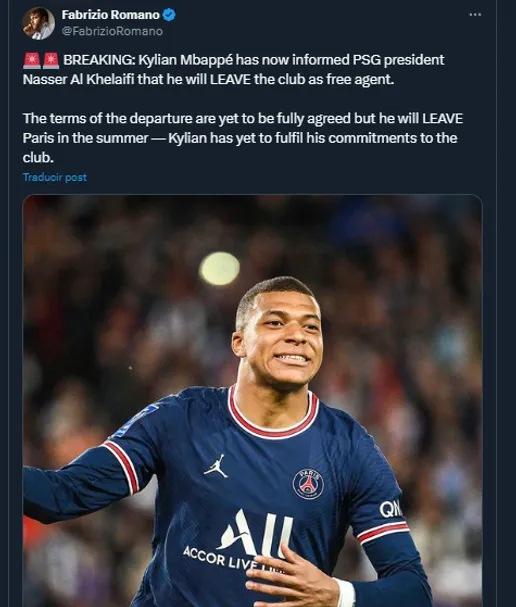 “Mbappé ya ha informado al presidente del PSG, Nasser Al Khelaifi, que dejará el club a final de temporada como agente libre. Las condiciones de salida están pendientes de una negociación, pero Mbappé se irá de París este verano. Kylian aún tiene que cumplir sus compromisos con el club”, escribió Fabrizio Romano a través de su cuenta oficial en la plataforma de X.