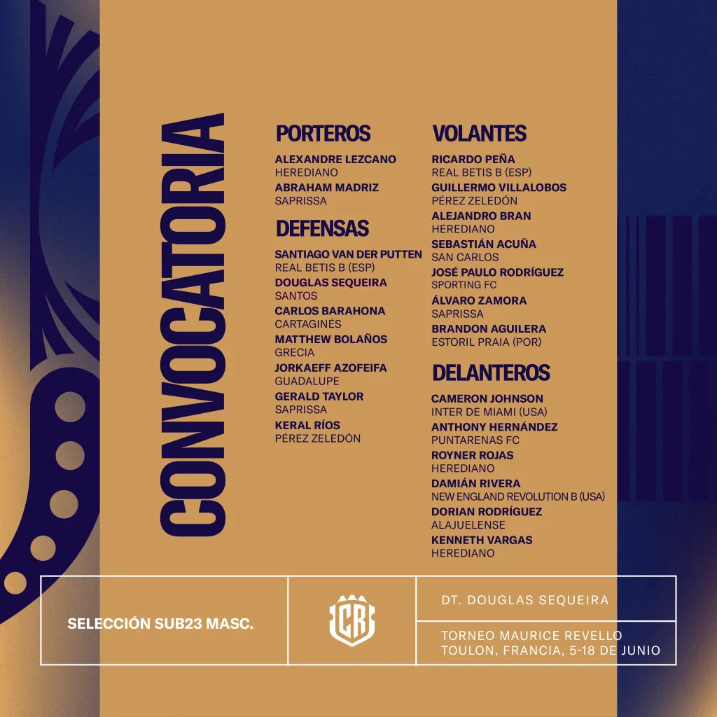 Por su lado, Douglas Sequeira también reveló a sus elegidos, que llevan casi un mes de entrenamientos, preparándose para el campeonato. Resalta la convocatoria de Damián Rivera, hombre del New England Revolution, quien consiguió su nacionalidad costarricense y debutaría con la camiseta centroamericana.