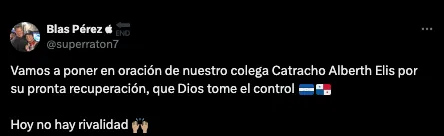 En su cuenta de X, el máximo goleador del conjunto Canalero (empatado con Luis Tejada), escribió lo siguiente: “Vamos a poner en oración de nuestro colega catracho, Alberth Elis, por su pronta recuperación, que Dios tome el control. Hoy no hay rivaldad”.