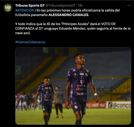 “En las próximas horas, podría oficializarse la salida del futbolista panameño, Alessandro Canales. Todo indica que la JD de los “Príncipes Azules” dará el VOTO DE CONFIANZA al DT uruguayo Eduardo Méndez, quién seguiría al frente de la nave azul”, expresó el medio, Tribuna Sports GT.