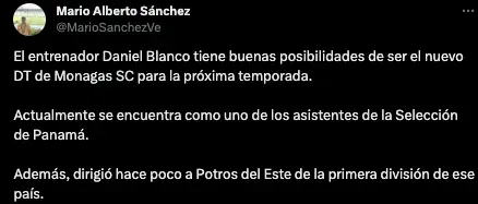 “El entrenador Daniel Blanco, tiene buenas posibilidades de ser el nuevo DT de Monagas SC para la próxima temporada. Actualmente se encuentra como uno de los asistentes de la Selección de Panamá. Además, dirigió hace poco a Potros del Este de la Primera División de ese país”, expresó Mario Sánchez, periodista experto en el mercado venezolano.