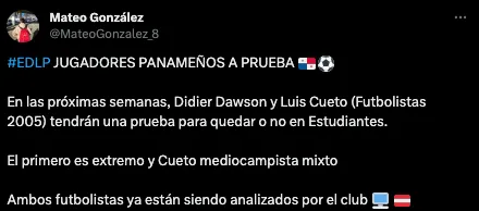 “Estudiantes de La Plata. JUGADORES PANAMEÑOS A PRUEBA. En las próximas semanas, Didier Dawson y Luis Cueto (futbolistas 2005), tendrán una prueba para quedar, o no, en Estudiantes. Dawson es extremo y Cueto mediocampista mixto. Ambos futbolistas ya están siendo analizados por el club”, expresó el cronista argentino, Mateo González.