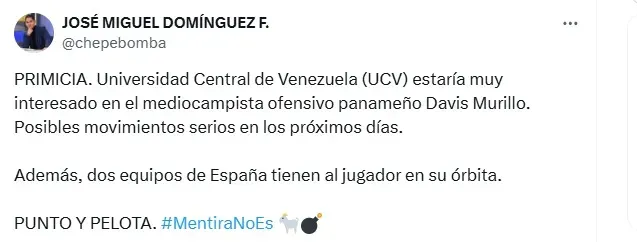 El que más intenciones parece llevar es la Universidad Central de Venezuela, equipo que juega en la máxima categoría del fútbol venezolano. “Posibles movimientos serios“, confirmó el periodista José Miguel Domínguez acerca del futuro de Murillo.