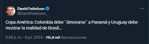 Durante la previa de este compromiso entre Colombia y Panamá, David Faitelson había sido contundente con un comentario a través de su cuenta oficial de X, en donde por parte de los canaleros había recibido varias críticas, pero al final el resultado le terminó dando la razón: “Copa América 2024: Colombia debe “devorarse” a Panamá”.