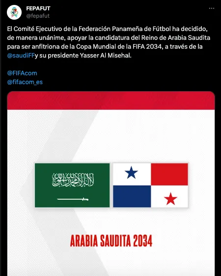 “El Comité Ejecutivo de la Federación Panameña de Fútbol ha decidido, de manera unánime, apoyar la candidatura del Reino de Arabia Saudita para ser anfitriona de la Copa Mundial de la FIFA 2034, a través de la @saudiFF y su presidente Yasser Al Misehal”, afirmaron en sus redes sociales.