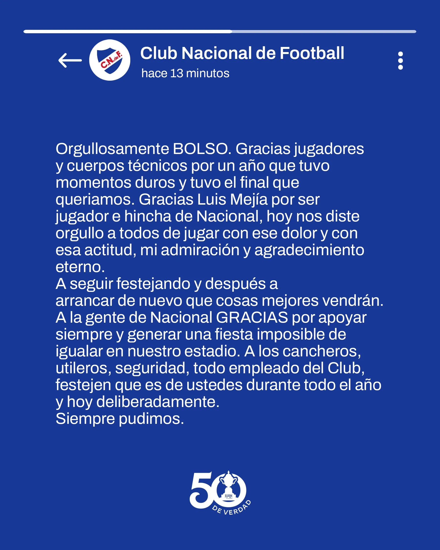 A seguir festejando y después a arrancar de nuevo que cosas mejores vendrán. A la gente de Nacional GRACIAS por apoyar siempre y generar una fiesta imposible de igualar en nuestro estadio. A los cancheros, utileros, seguridad, todo empleado del Club, festejen que es de ustedes durante todo el año y hoy deliberadamente. Siempre pudimos“.