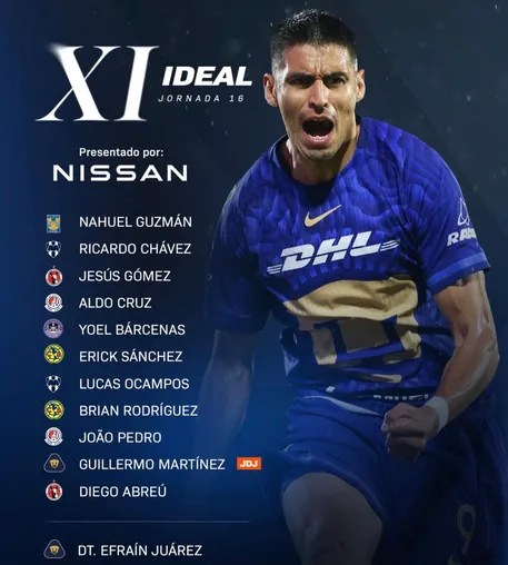 Su actuación no pasó desapercibida. Gracias a su gol y su influencia en el juego, Bárcenas fue incluido en el once ideal de la jornada 16, un reconocimiento que confirma el gran momento que atraviesa en el fútbol mexicano.