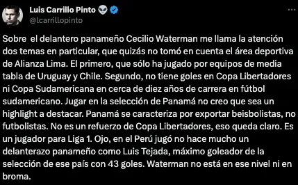 “Sobre el delantero panameño, Cecilio Waterman, me llama la atención dos temas en particular que, quizás, no tomó en cuenta Alianza Lima. Solo ha jugado por equipos de media tabla de Uruguay y Chile. No tiene goles en Libertadores ni Sudamericana en cerca de diez años de carrera. No es un refuerzo de Copa Libertadores, eso queda claro. Es un jugador para Liga 1”, manifestó el periodista.