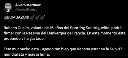“Raheen Cuello, volante de 16 años del Sporting San Miguelito, podría firmar con la Reserva del Dunkerque de Francia. En este momento está probando y ha gustado”, expresó el periodista, Álvaro Martínez, afirmando que el chico podría mantenerse en el Viejo Continente.