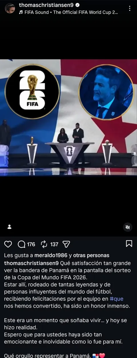 A través de su cuenta oficial de Instagram, Christiansen compartió un mensaje cargado de sentimiento. “Qué satisfacción tan grande ver la bandera de Panamá en la pantalla del sorteo de la Copa del Mundo FIFA 2026”, escribió el entrenador, quien también destacó el privilegio de estar rodeado de “leyendas y personas influyentes del mundo del fútbol” durante la ceremonia celebrada en Estados Unidos.