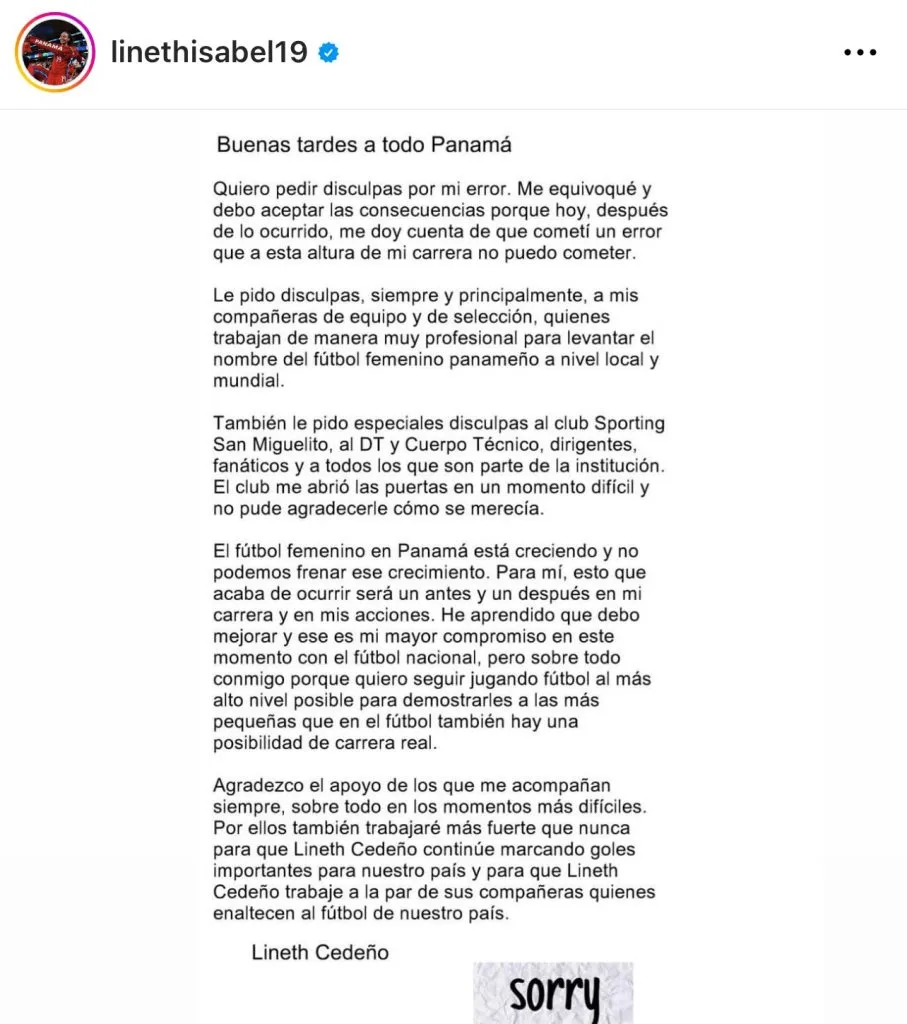 Y después de su separación del equipo, la atacante envió un comunicado en redes sociales, en el que pedía disculpas por su actitud errónea: “Quiero pedir disculpas por mi error. Me equivoqué y debo aceptar las consecuencias porque hoy, después de lo ocurrido, me doy cuenta de que cometí un error, que a esta altura de mi carrera, no puedo cometer”, inició.