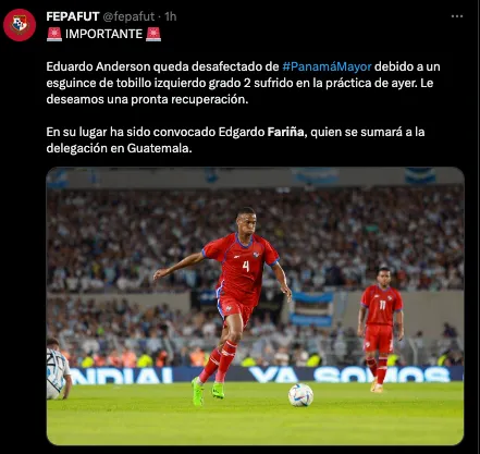 “Eduardo Anderson queda desafectado de #PanamáMayor debido a un esguince de tobillo izquierdo grado 2 sufrido en la práctica de ayer. Le deseamos una pronta recuperación. En su lugar ha sido convocado Edgardo Fariña, quien se sumará a la delegación en Guatemala”, expresó la Fepafut, a través de sus redes sociales.
