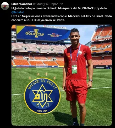 “El guardameta panameño, Orlando Mosquera del Monagas y de la Selección de Panamá, está en negociaciones avanzadas con el Maccabi Tel-Aviv de Israel. Nada concreto aún. El club ya envió la oferta”, expresó el comunicador sobre fichajes del fútbol venezolano, Eduar Sánchez.