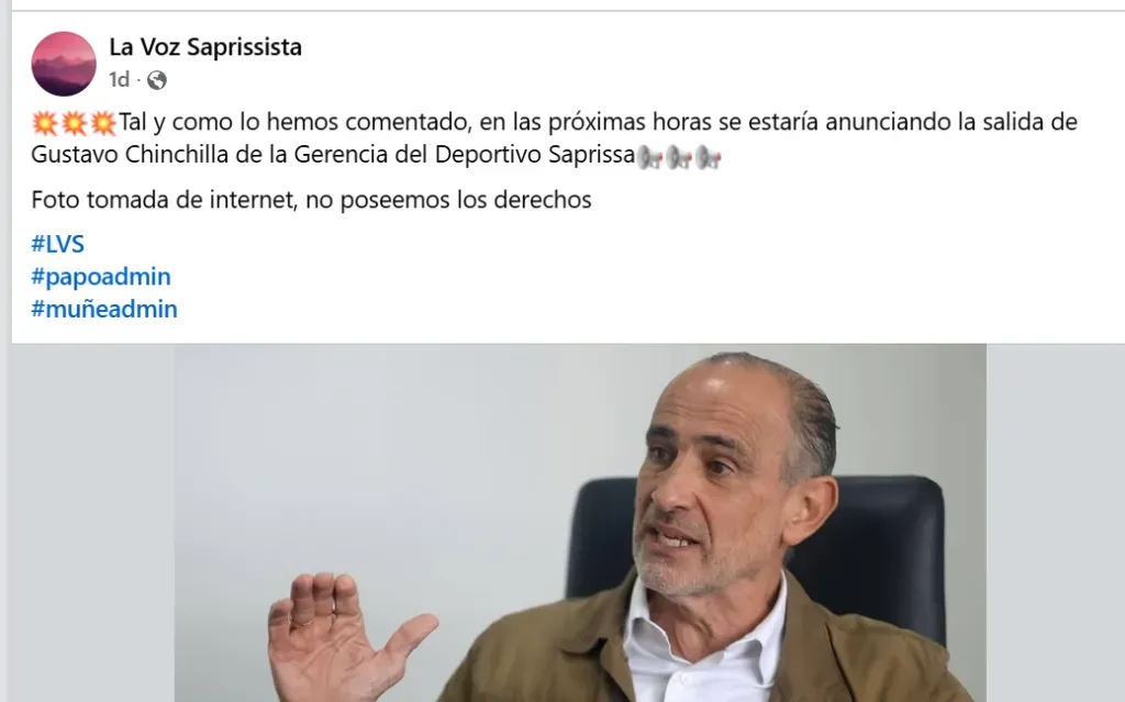 Ahora, el medio La Voz Saprissista encendió todas las alarmas en Tibás al lanzar un auténtico bombazo: “En las próximas horas se estaría anunciando la salida de Gustavo Chinchilla de la Gerencia del Deportivo Saprissa”, publicó el medio especializado en la actualidad morada.