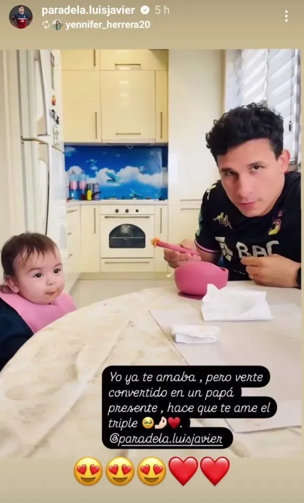 Sin embargo, sus días los pasa con la camiseta del Monstruo. Así lo dejó ver en su cuenta de Instagram tras compartir un posteo de su esposa, quien lo mostró en su rol de padre, alimentado a su hija, pero vistiendo con una camiseta del morado de entrecasa.