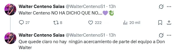 “Walter Centeno NO HA DICHO QUE NO”, escribió en su cuenta de X Walter Centeno Salas, quien se explayó sobre la situación de su padre: “Que quede claro, no hay ningún acercamiento de parte del equipo a Don Walter”, afirmó el primogénito de Paté.