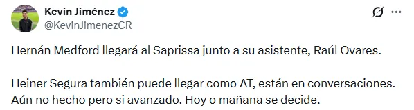 Sin embargo, el periodista Kevin Jiménez puso en duda la llegada del segundo asistente Segura. “Puede llegar, están en conversaciones. Aún no hecho, pero sí avanzado. Hoy o mañana se decide“, confirmó sobre el ex Alajuelense.