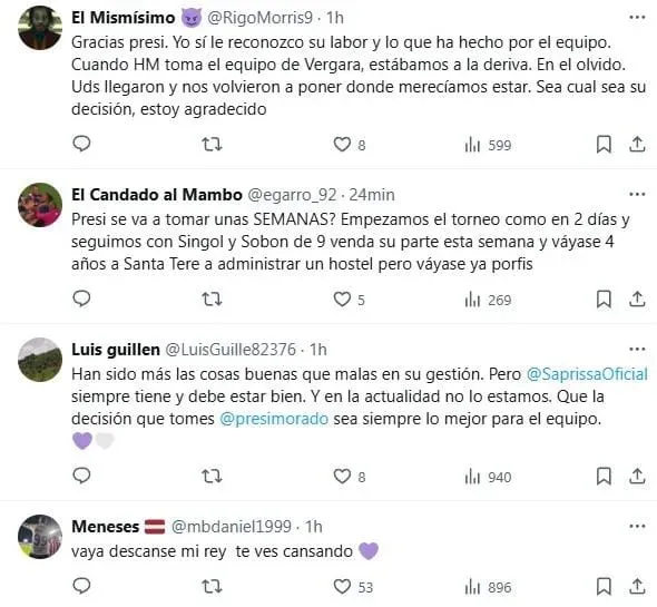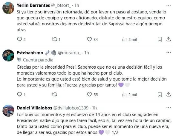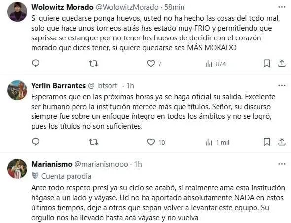 Naturalmente, los comentarios del tuit se llenaron de aficionados Morados —al menos, los que se encuentran en X— que expresaron enfáticamente su postura: algunos respaldaron a Juan Carlos Rojas y la mayoría pidió su salida de Saprissa.