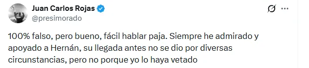 “100% falso, pero bueno, fácil hablar paja. Siempre he admirado y apoyado a Hernán, su llegada antes no se dio por diversas circunstancias, pero no porque yo lo haya vetado“, explicó Rojas sobre las razones de porqué Medford no fue contratado en su ciclo como presidente.