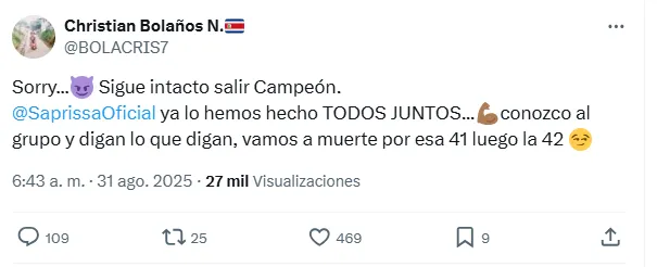 “Sorry… Sigue intacto salir campeón. Saprissa: ya lo hemos hecho todos juntos… conozco al grupo y digan lo que digan, vamos a muerte por esa 41, luego la 42″, escribió Bolaños en sus redes sociales.