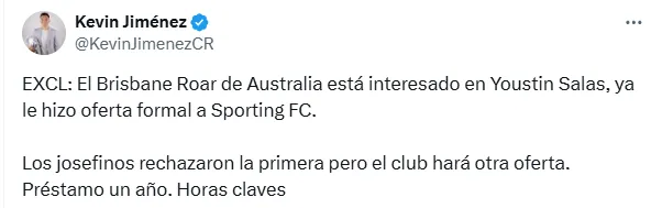 Según la información del periodista Kevin Jiménez, el conjunto de la máxima categoría de Australia ya le hizo una “oferta formal a Sporting FC”. Esta fue rechazada, pero le enviarán una nueva propuesta para concretar el préstamo de un año que pretenden.