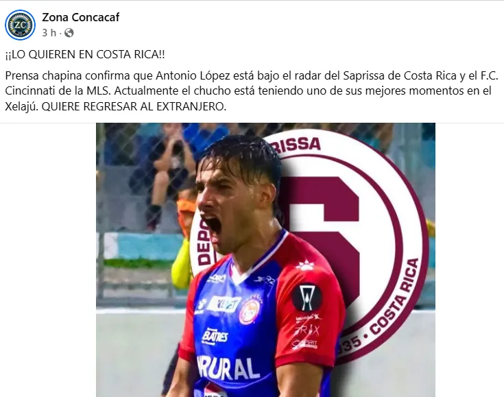 Según reveló Zona Concacaf en su cuenta de Facebook, la prensa chapina informa que Antonio Chucho López está en el radar del Saprissa. “Lo quieren en Costa Rica“, afirmó. Además, el otro interesado sería el FC Cincinnati de la Major League Soccer.