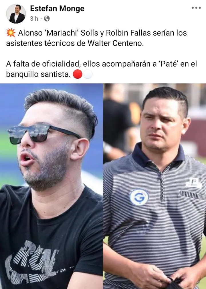 El periodista Estefan Monge dio a conocer que el ex futbolista de Saprissa, Alonso Solís, será uno de los asistentes de “Paté” Centeno, flamante técnico de Santos para el Torneo Clausura 2025, junto a Rolbin Fallas.