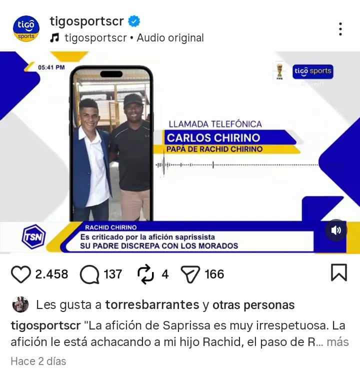 La reacción contra Gerson Torres se originó luego de que el jugador le diera “like” a una publicación de Tigo Sports Costa Rica que recogía las declaraciones del padre de Rachid Chirino, en las que señalaba que la afición del Deportivo Saprissa es muy irrespetuosa.